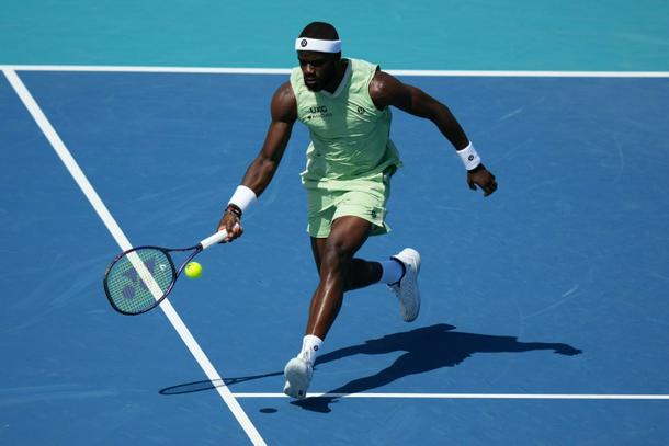 Frances Tiafoe returns a shot on his way to defeating defending champion Jakub Mensik at the Miami Open