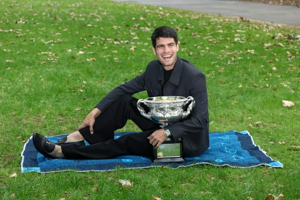 Carlos Alcaraz poses with the Australian Open trophy at the Royal Exhibition Building in Melbourne on Monday after completing the career Grand Slam