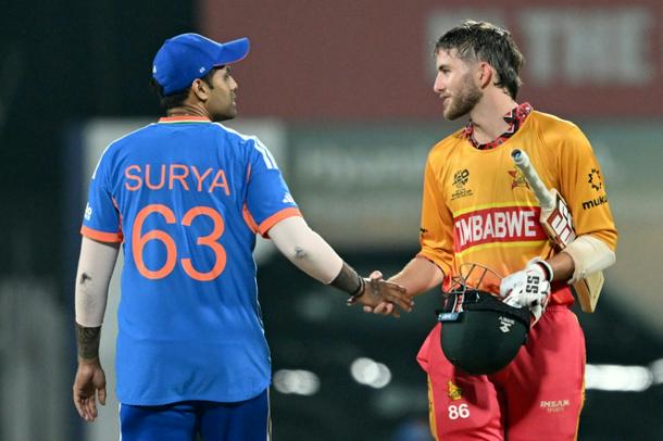 Zimbabwe's Brian Bennett (R) congratulates India's captain Suryakumar Yadav after their win
