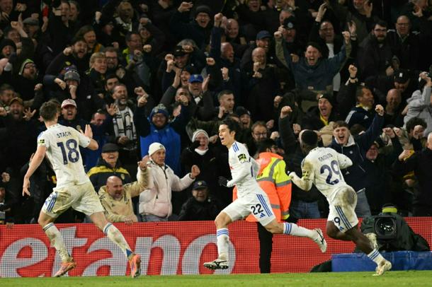 Leeds's Ao Tanaka (C) salvaged a 3-3 draw to intensify the pressure on Liverpool boss Arne Slot