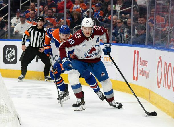 Canadian forward Nathan MacKinnon of the Colorado Avalanche carries the puck ahead of compatriot Connor McDavid of the Edmonton Oilers during an NHL game, but the stars will be teammates at the Winter Olympics