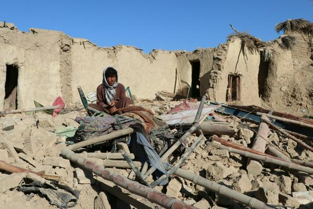 A resident sits at a damaged house after an air strike Afghanistan's Taliban government blamed on Pakistan in Jige Mughalgai in Khost province