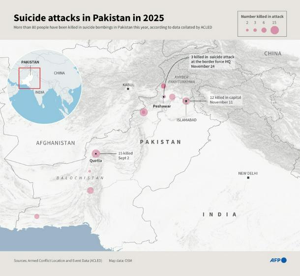 Infographic map showing suicide attacks that have taken place in Pakistan in 2025, as of November 24, according to data collated by ACLED.