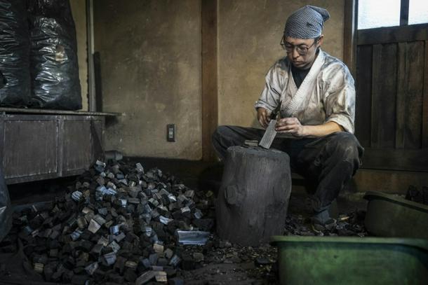 Apprentice Toru Watanabe breaks charcoal into smaller pieces for the forge at a workshop in Misato, Saitama prefecture