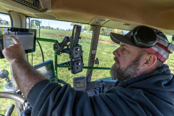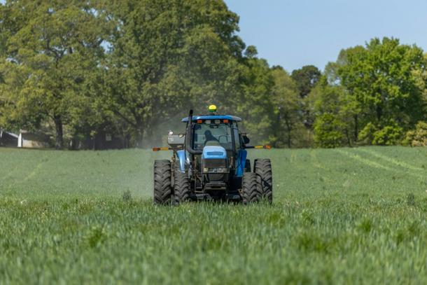 Fertilizer is spread across a field in North Carolina, where Andy Corriher farms