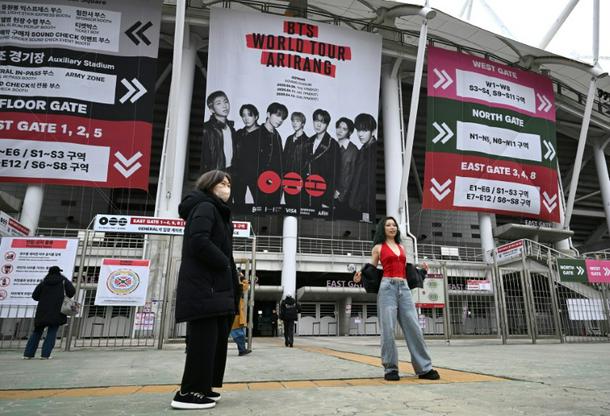 Pedestrians walk in front of a banner welcoming BTS fans near a stadium where K-pop boy band BTS will perform in Goyang on April 9, 2026.