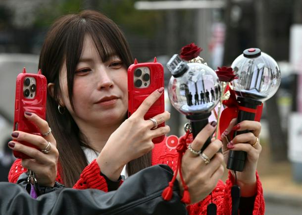Fans take pictures of BTS light sticks as they arrive at a stadium where the group will perform in Goyang on April 9, 2026.