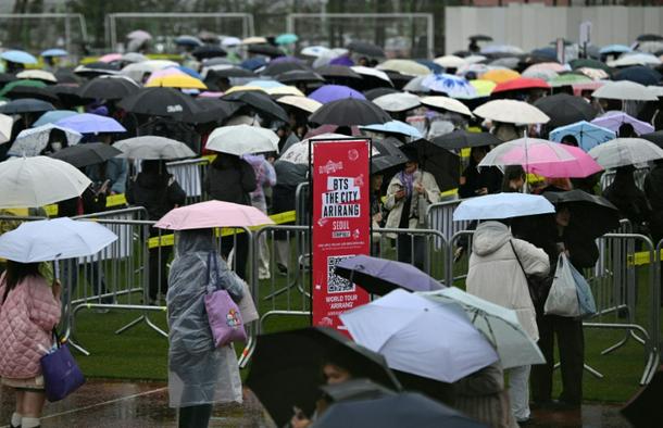 BTS fans take shelter from the rain as they arrive at a stadium where K-pop boy band BTS will perform in Goyang on April 9, 2026.