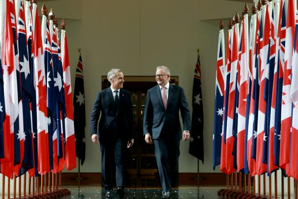 Australian Prime Minister Anthony Albanese and his Canadian counterpart Mark Carney (L) walk through the corridors of Parliament House in Canberra on March 5, 2026.