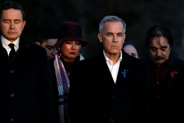 Prime Minister Mark Carney (R) and the leader of the Conservative Party Pierre Poilievre (L) observe a moment of silence to honor the victims of one of Canada’s deadliest shootings
