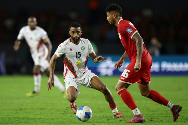 Suriname defender Djavan Anderson (L) in action against Panama in a World Cup qualifier in October