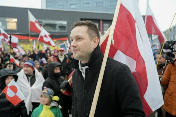 The protesters, including the territory’s prime minister, Jens-Frederik Nielsen, waving a Greenlandic flag, chanted slogans and traditional Inuit songs under light rain.