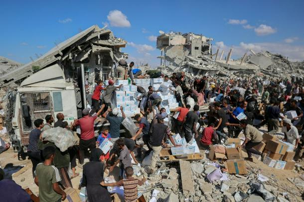 Palestinians rally around aid trucks which entered from the Karem Abu Salem crossing, in Khan Yunis in the southern Gaza Strip on October 12, 2025