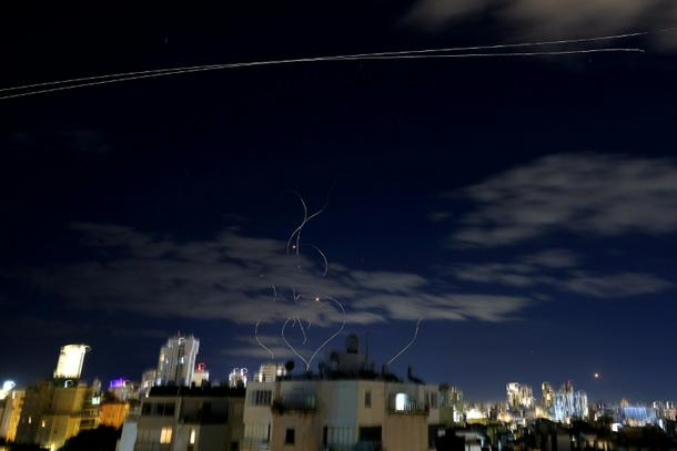 Rocket trails in the sky above the central Israeli coastal city of Netanya