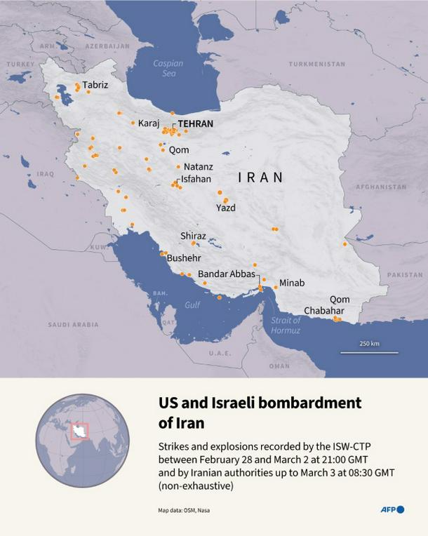 Infographic with map of Iran showing US and Israeli strikes and explosions recorded by the Institute for the Study of War and AEI's Critical Threats Project, as of March 2 at 0900 PM GMT, and by Iranian authorities, as of March 3 at 0830 GMT (non-exhaustive list)