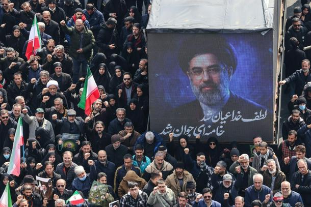 A screen displays a portrait of Iran's new supreme leader Mojtaba Khamenei during the funerals of Iran's Revolutionary Guards Corps (IRGC) commanders, army commanders and others killed in the early days of the United States and Israeli strikes on Iran, at Enghelab Square in Tehran on March 11, 2026