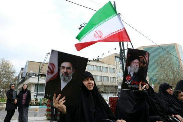 Iranian women hold portraits of Iran's supreme leader Mojtaba Khamenei (R) and Iran’s slain supreme leader Ayatollah Ali Khamenei (L) while gathering in front of Tehran's Mellat park on April 2, 2026