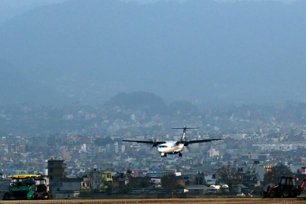 An airplane lands at the Tribhuvan International airport in Kathmandu, where Nepalese authorities have nearly doubled aviation fuel prices as global energy costs surge because of the war