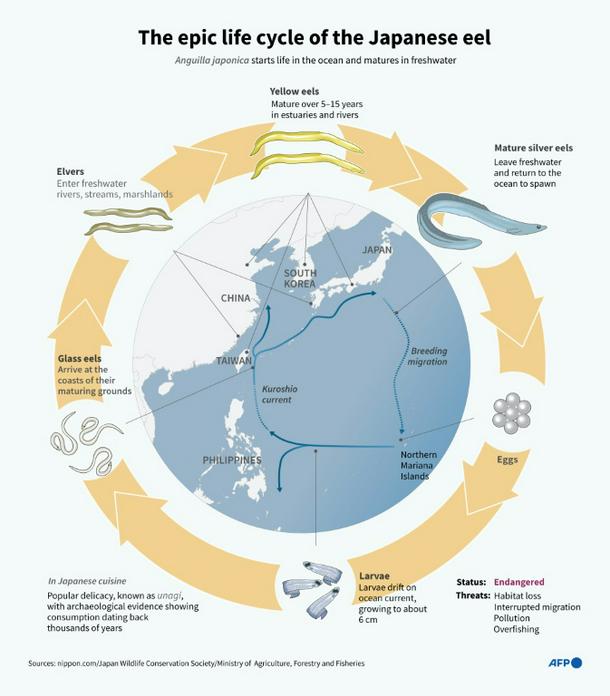Infographic on the migration of the endangered Japanese eels from their spawning grounds in the Mariana Islands to their maturing sites in freshwater estuaries and rivers.