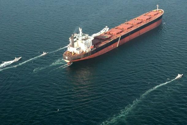 A handout photo by Iran's Revolutionary Guards Corps (IRGC) showing boats manoeuvering around a tanker vessel in the Strait of Hormuz