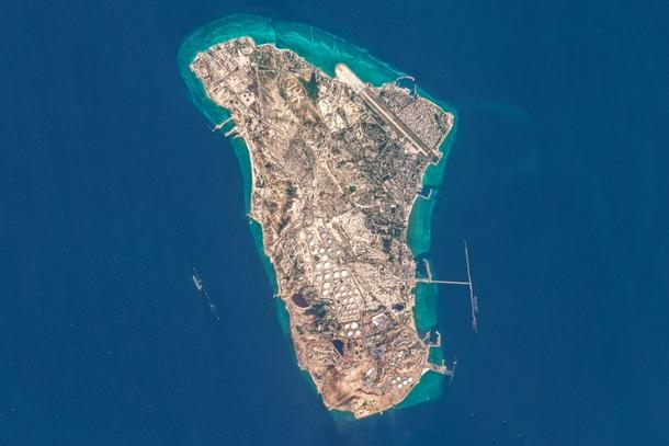 A satellite image of Iran's Kharg Island, which hosts the country’s main crude export terminal