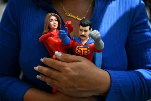 A woman holds toys depicting Venezuela's deposed President Nicolas Maduro and his wife, Cilia Flores, in Caracas