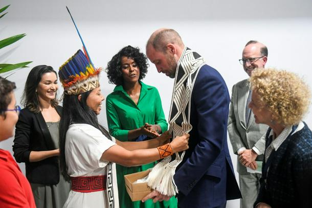 Britain's Prince William, Prince of Wales, receives an indigenous vest from Brazil's indigenous leader Vanda Witoto during a private meeting before the United for Wildlife Forum in Rio de Janeiro, Brazil on November 4, 2025