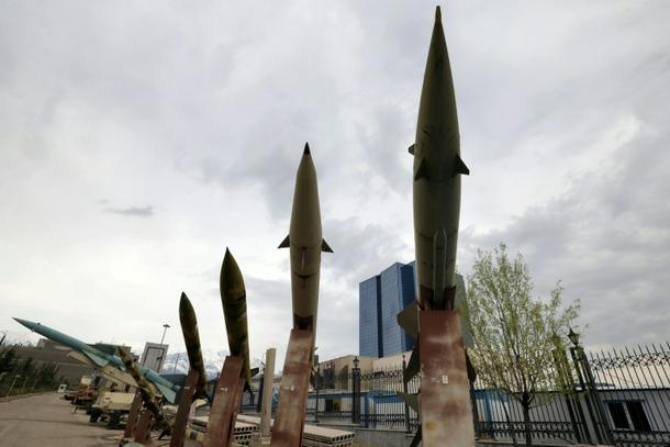 Mockups of domestically-made Iranian missiles are displayed at an exhibition outside the Defence Museum in Tehran on March 31, 2026