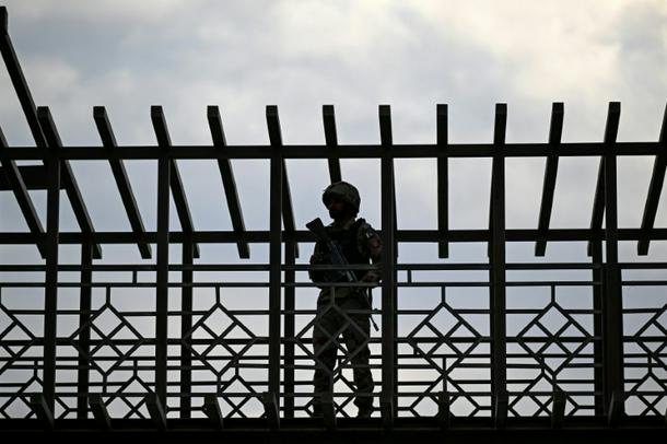 A Pakistani soldier stands guard at the Pakistan-Iran border crossing at Taftan