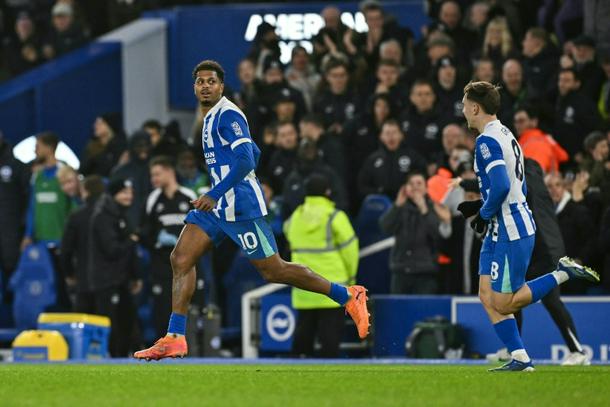 Brighton's Georginio Rutter (L) celebrates scoring against West Ham