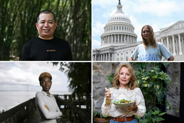 Clockwise from top left: Khomchalat Thongting of Thailand, the founder of Wongphai, a company that supports farmers in converting crop residues into biochar; Eva Lighthiser of the United States, the lead plaintiff in Lighthiser v. Trump, a climate lawsuit; overnight vegan Anne Chassaignon of France; and Saviour Iwezue of Nigeria, a political science student at the University of Lagos who founded the Team Illuminate collective to raise environmental awareness
