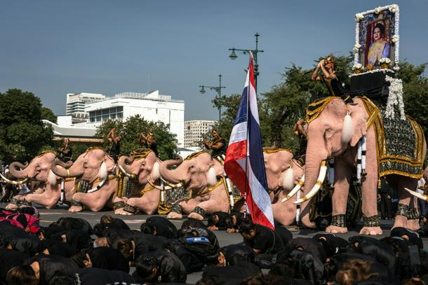 The late queen’s portrait sat high on the back of one of the elephants, which had gold-adorned tusks and wore traditional caparisons as they marched past the Grand Palace.