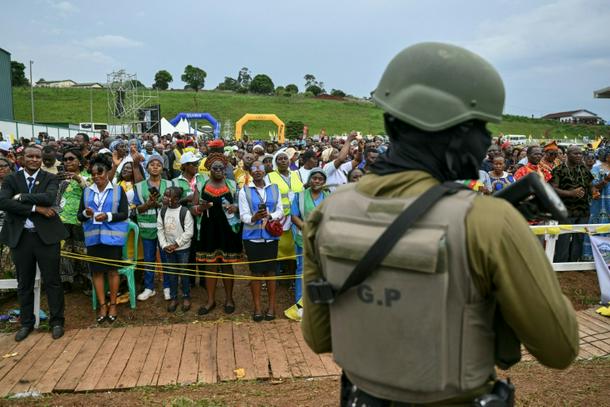 A Cameroonian soldier stands guard as the pope leads mass at Bamenda Airport