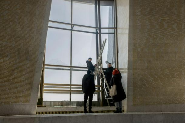 Windows were damaged at the base of the Motherland statue that towers over Kyiv