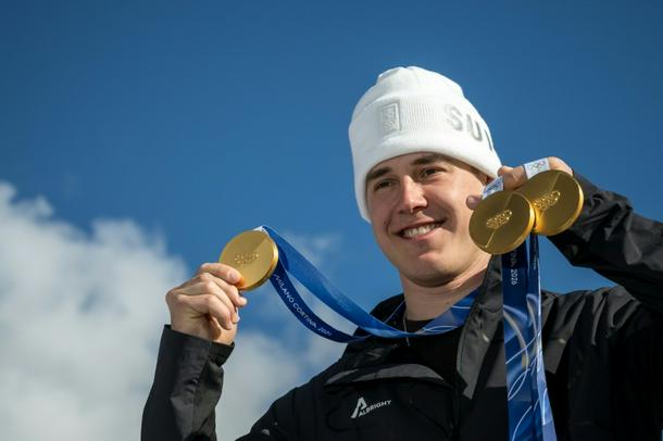 Switzerland's Franjo von Allmen poses with his three gold medals