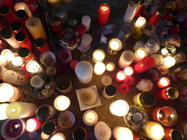 People gather around a makeshift memorial to pay their respects by leaving flowers, candles and messages near Le Constellation bar in Crans-Montana