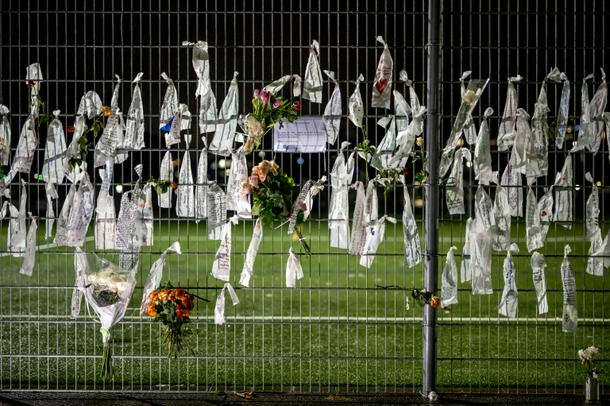 Flowers and tributes attached to the fence at the ground of Swiss club FC Lutry, which lost several young players in the blaze