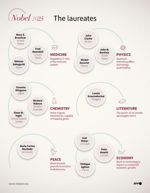 Stockholm (AFP) - The Nobel prize in economics was awarded on Monday to American-Israeli Joel Mokyr, France’s Philippe Aghion and Canada’s Peter Howitt for work on how technology drives and affects growth.