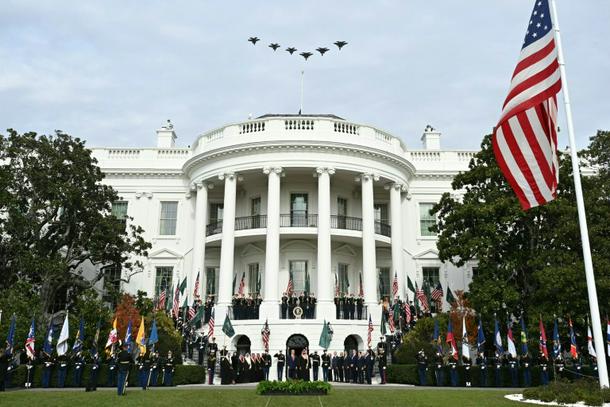 The Saudi royal was greeted by Trump, cannon fire and a fighter jet flyover when he arrived at the White House