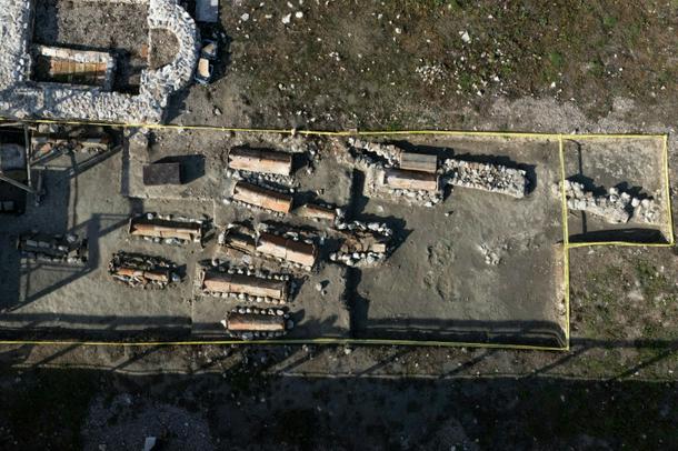 “So far, we’ve determined there are around 300 graves,” he said, pointing to the terracotta tile tombs denoting burial sites. Under one, two visibly broken bones were visible alongside a partial jawbone with teeth.