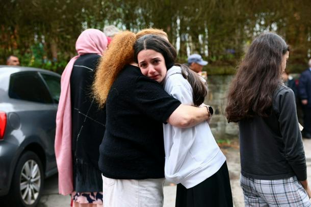Members of the community comfort each other near Heaton Park Hebrew Congregation Synagogue in north Manchester