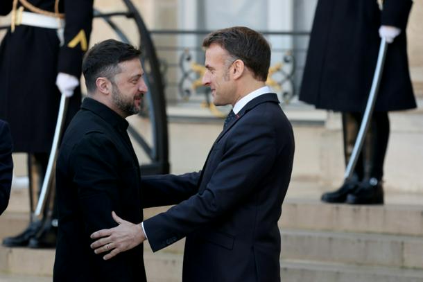 French President Emmanuel Macron welcomes Ukraine's President Volodymyr Zelensky to the Elysee palace