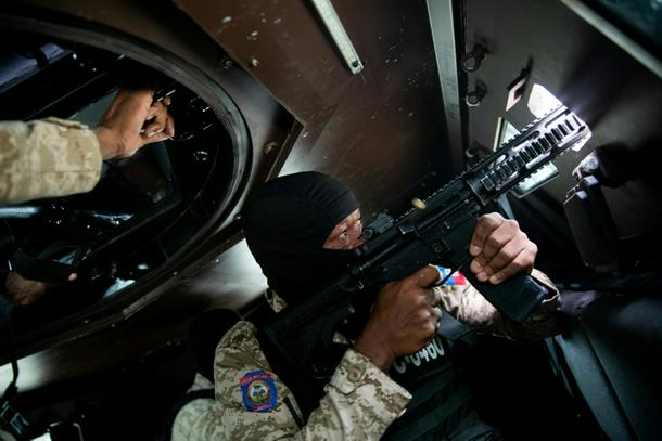 A Haitian police officer aims his weapon out a window of an armored vehicle during a patrol in downtown Port-au-Prince in January 2026