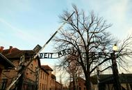 An emaciated and apparently blind man stands in the snow at the Nazi concentration camp of Flossenbuerg: the image seems …