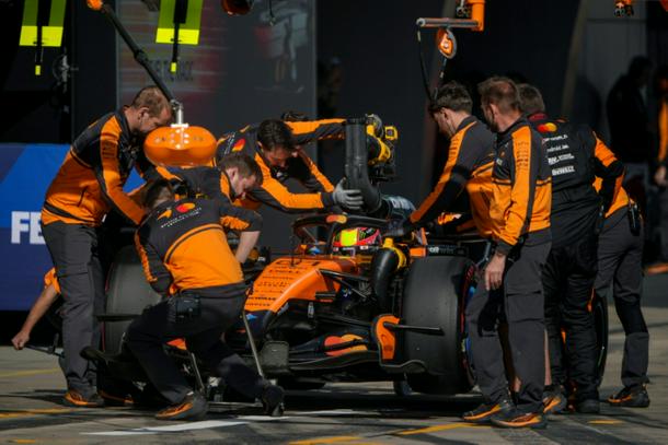Mechanics work on the car of McLaren's Australian driver Oscar Piastri no Saturday