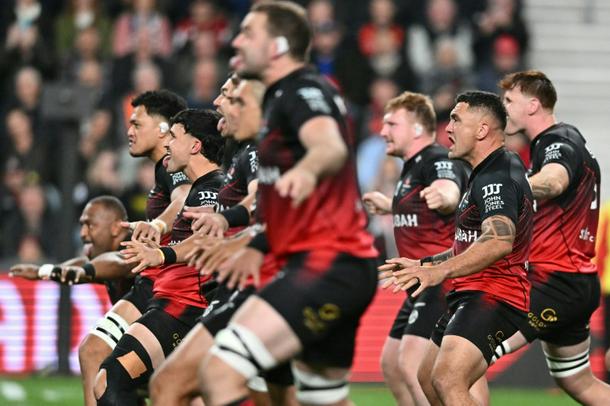 Crusaders' players perform a haka before the Super Rugby Pacific match between the Canterbury Crusaders and NSW Waratahs at One New Zealand Stadium in Christchurch on April 24, 2026.