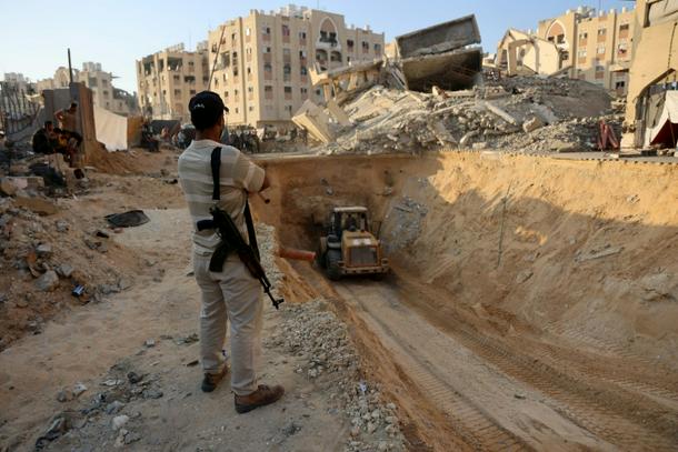 An armed Palestinian man looks at an excavator reportedly digging for the bodies of Israeli hostages