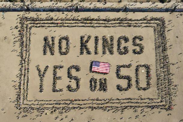 Protesters in San Francisco formed a human banner during their protest, with a message to vote 'yes' on a proposition to redraw congressional districts