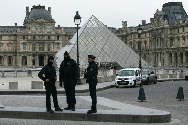 Outside the Louvre, soldiers patrolled the famed glass pyramid entrance, while evacuated visitors, tourists and passersby were kept at a distance behind police tape.